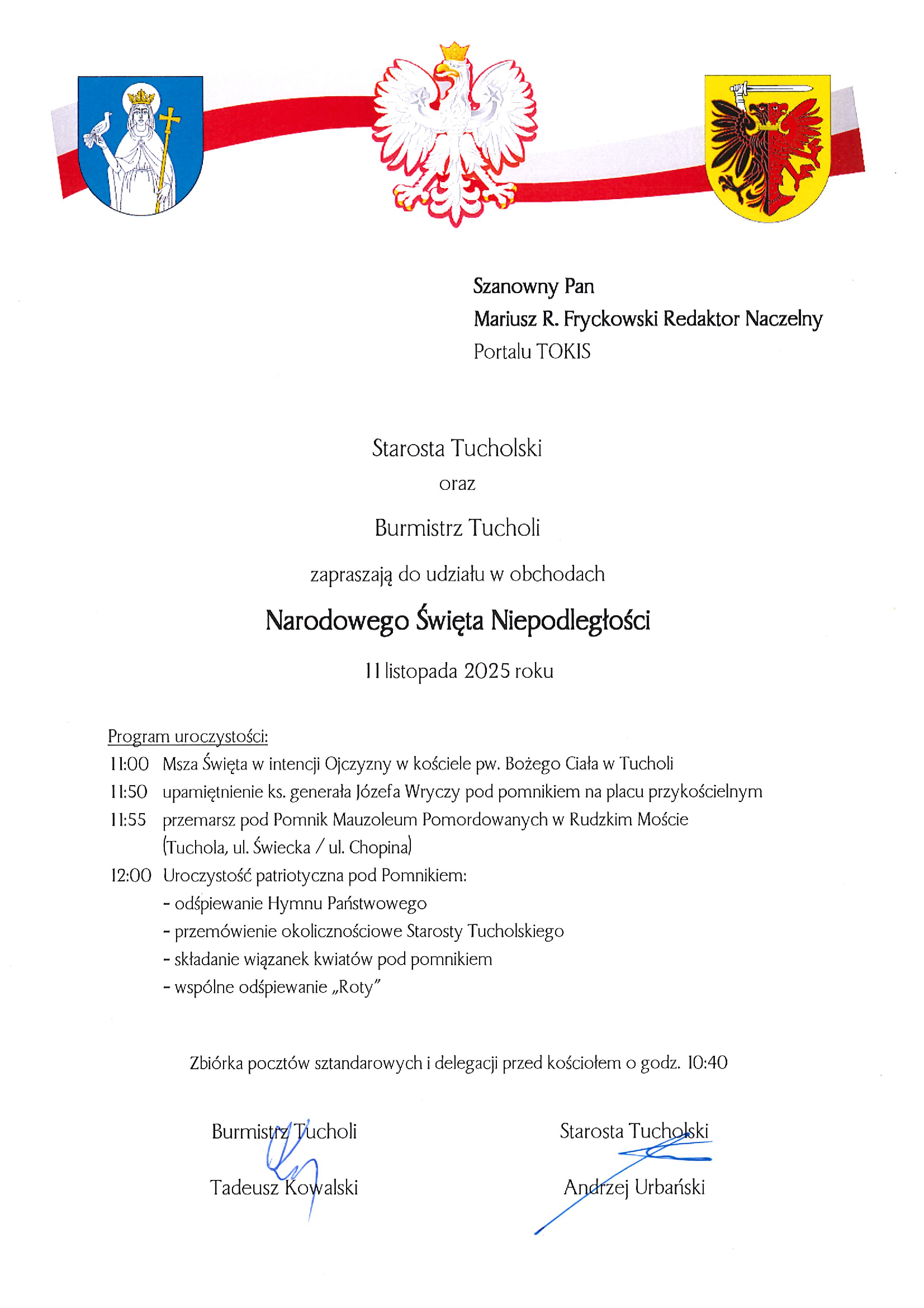 Starosta Tucholski Andrzej Urbański oraz Burmistrz Tucholi Tadeusz Kowalski zapraszają do udziału w obchodach Narodowego Święta Niepodległości 11 listopada 2025 roku.