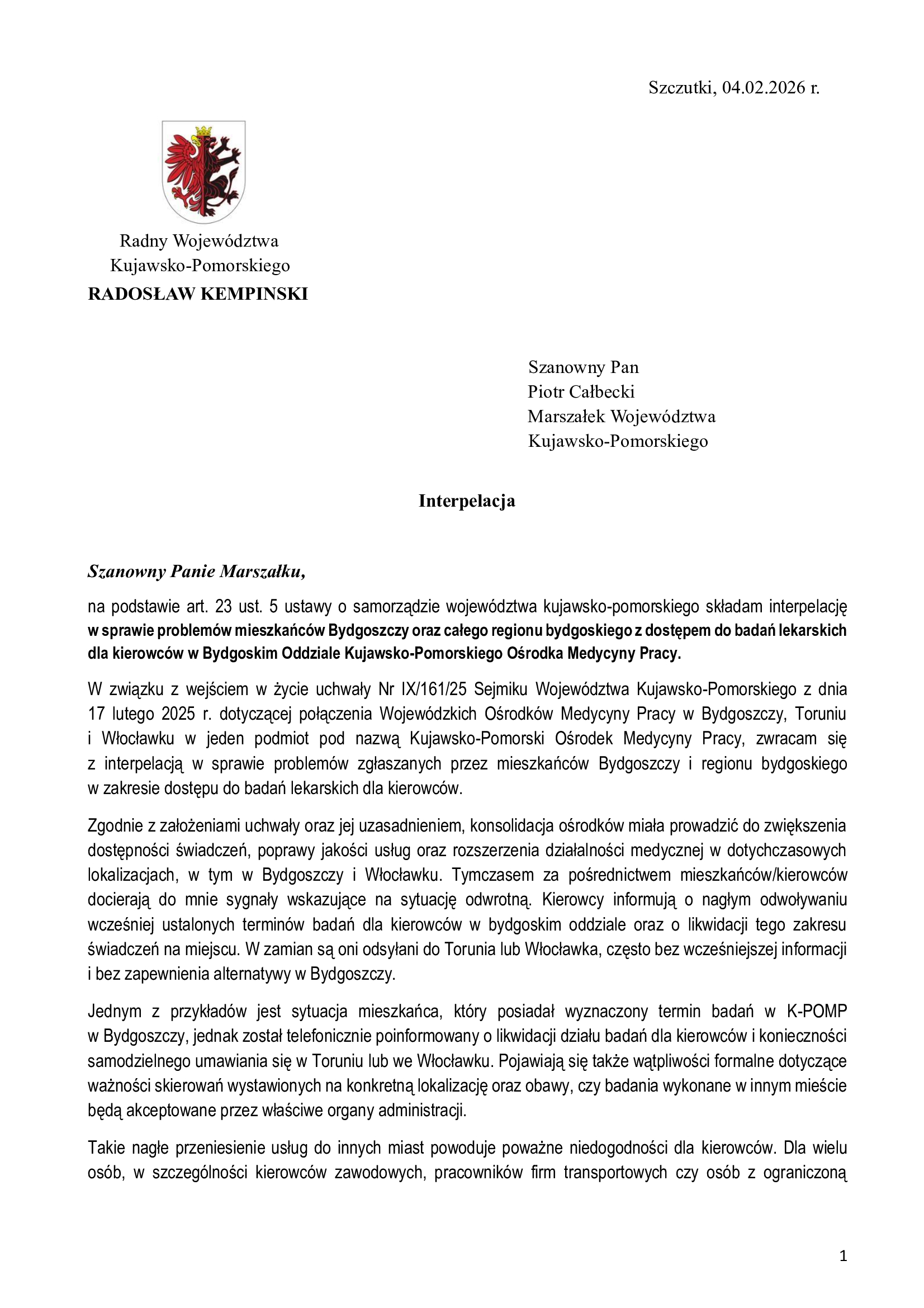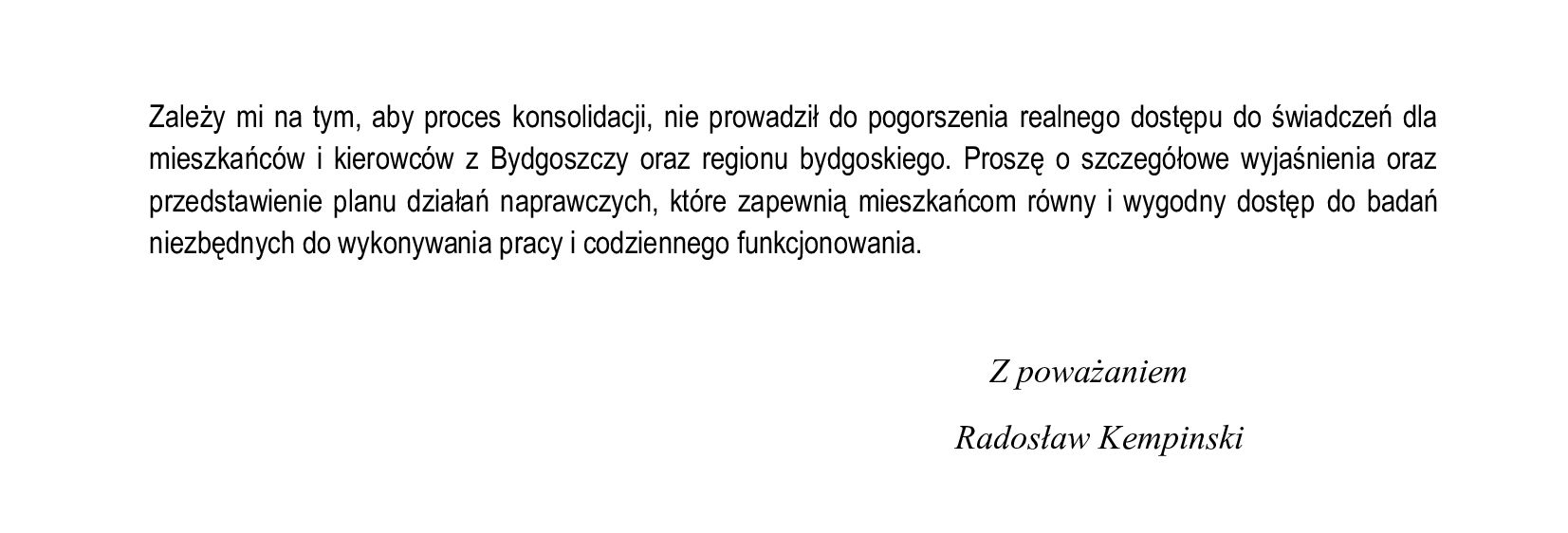 Docierają do mnie sygnały od kierowców: odwołane wizyty, nagłe informacje, że badań dla kierowców w Bydgoszczy już nie ma i trzeba jechać do innych miast… np. Torunia, a nawet Włocławka. Tak nie powinno wyglądać „zwiększanie dostępności świadczeń”, które marszałek województwa zapowiadał przy łączeniu ośrodków medycyny pracy. Dla wielu osób to dodatkowe koszty, utrata czasu pracy i ryzyko problemów z uprawnieniami zawodowymi. Dziś mieszkańcy zaczynają odczuwać konsekwencje tej decyzji.
