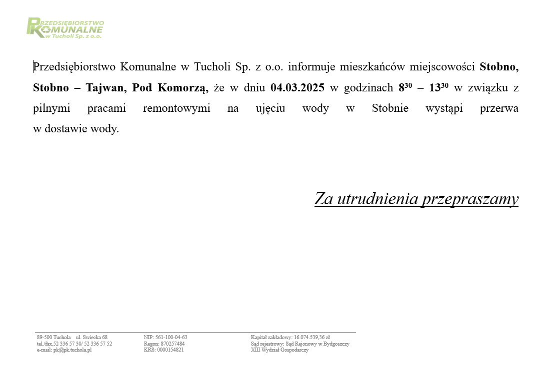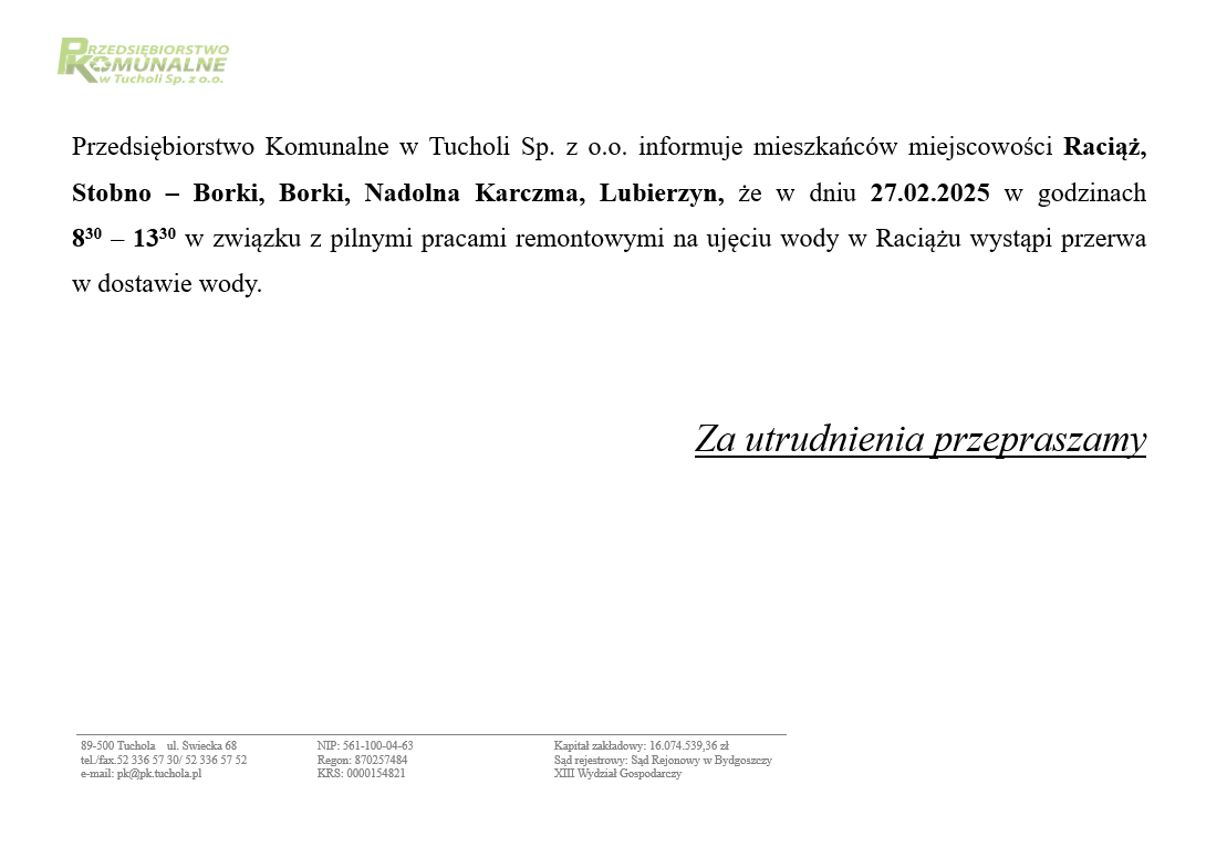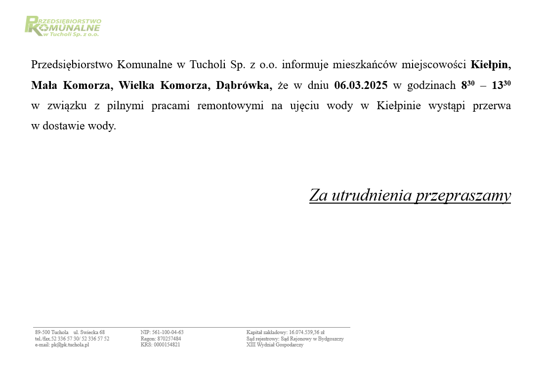 UWAGA! PK TUCHOLA INFORMUJE! Przerwy w dostawie wody! Gdzie i kiedy? 23 lutego 202623 lutego 2026 admin Estimated read time 1 min read Prosimy o zaznajomienie się z informacjami, które przekazuje tucholskie PK. (red.)