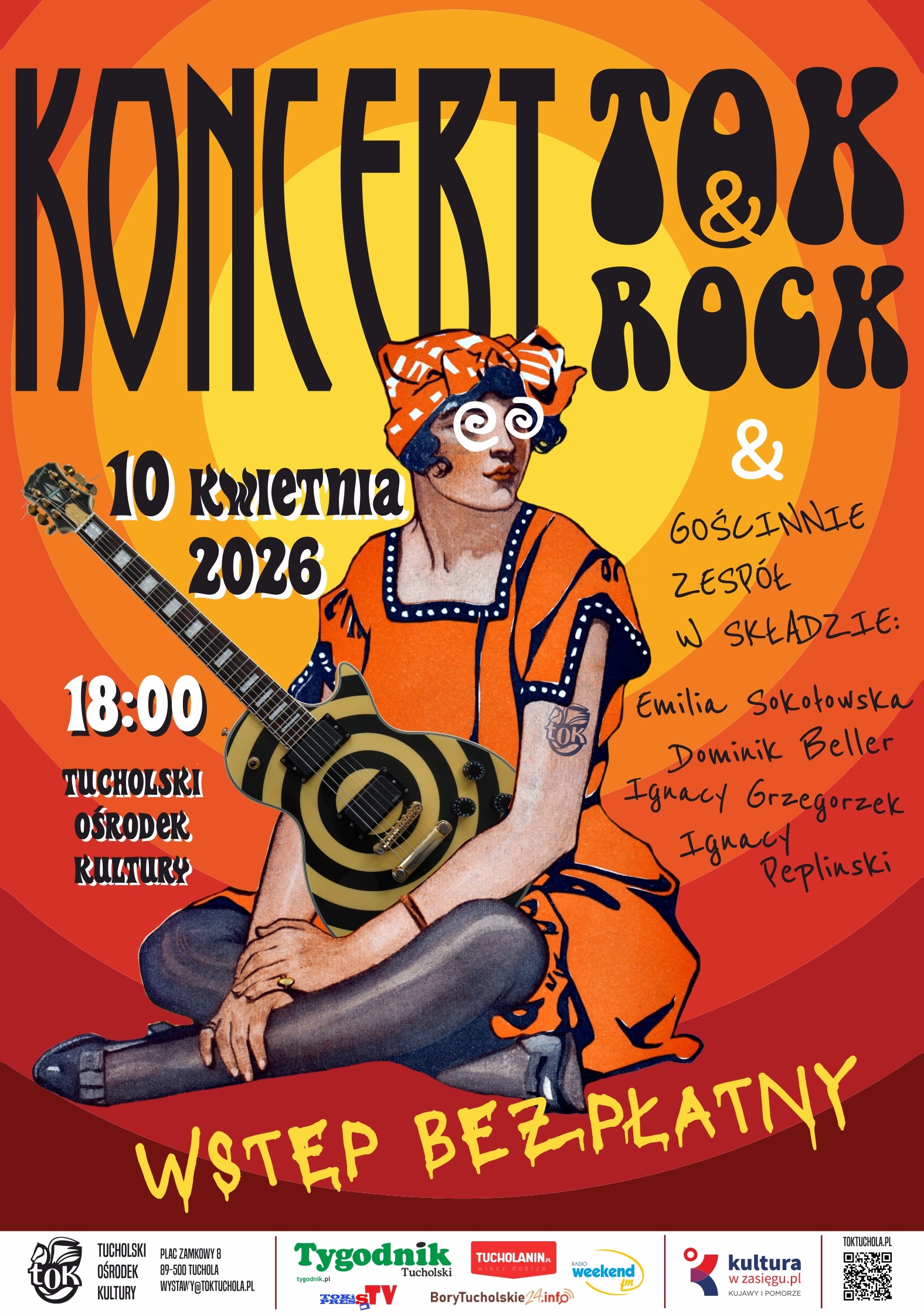 Już 10 kwietnia 2026 r. o godz. 18:00 w sali widowiskowej Tucholskiego Ośrodka Kultury odbędzie się koncert zespołu TOK&ROCK! Gościnnie wystąpi również grupa w składzie: Emilia Sokołowska, Dominik Beller, Ignacy Grzegorzek oraz Ignacy Peplinski. W ich wykonaniu usłyszycie covery polskiej i zagranicznej sceny alternatywnej. Wstęp bezpłatny.